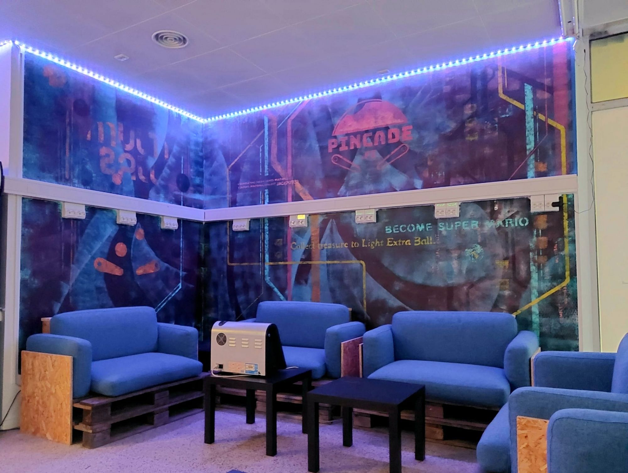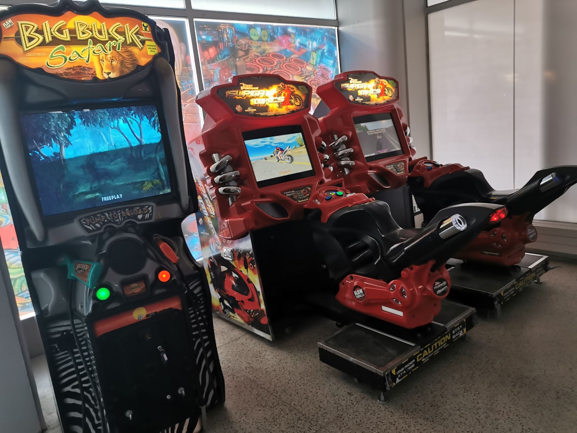 Paljon pelikoneita eri aikakausilta. Pelikoneet vaihtuvat aika-ajoin.